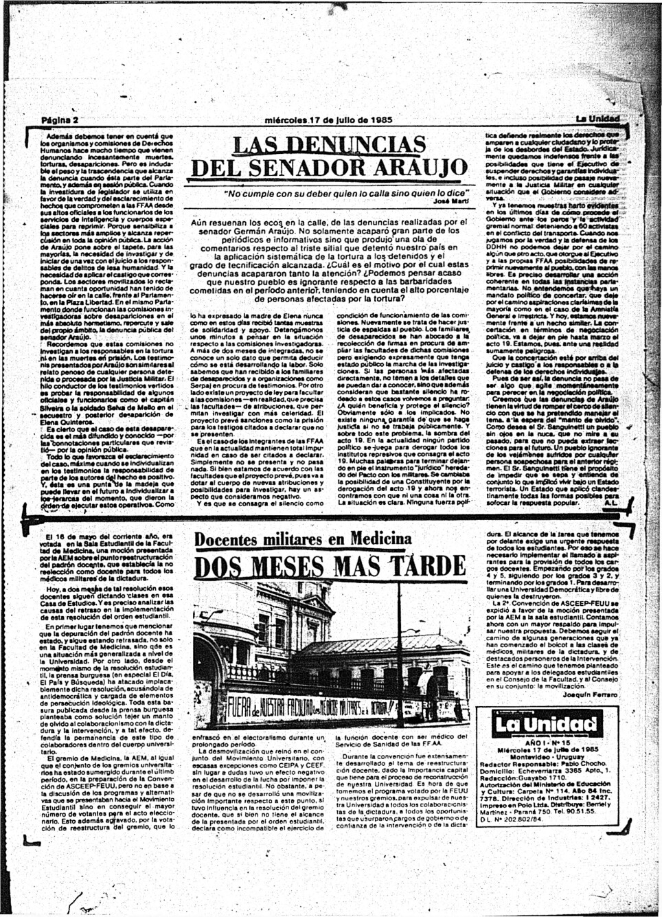 Testimonio de Ana Inés Quadros Herrera en el marco de una audiencia del Juicio a las Juntas de Argentina, que tuvo lugar el 14 de junio de 1985.