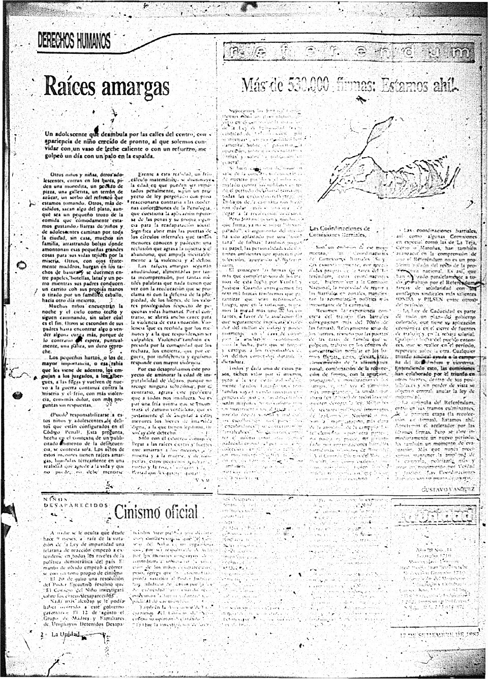 Abre con el editorial “El porqué de la Revista”, donde se define el carácter plural, no gubernamental y pedagógico del proyecto. En Informaciones y comentarios se destacan: “Acciones legales contra la Impunidad del Terrorismo de Estado”, análisis jurídico-político de la Ley 15.848 (Caducidad), con el detalle de estrategias de inconstitucionalidad y recursos internacionales; las “Actividades del IELSUR” de 1987 (patrocinio de causas, asesoramiento, salud mental, medio ambiente); el artículo “Uruguay no cumple obligaciones internacionales que ha asumido” sobre los informes pendientes ante el Comité de Derechos Humanos de la ONU y el Comité para la Eliminación de la Discriminación Racial; y “El examen de la conducta ética de médicos durante la dictadura militar”, que revisa estándares deontológicos y normativa internacional. La sección Doctrina incluye “El movimiento de derechos humanos en el Uruguay” (síntesis histórico-sociológica de su emergencia y agendas) y “El exilio de los enfermos mentales pobres” (mirada crítica sociosanitaria).