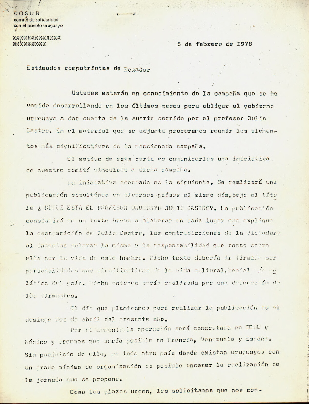 Estimados compatriotas de Ecuador [sobre desaparición de Julio Castro]
